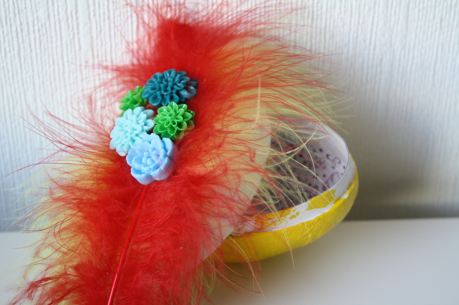 I påska malte og pyntet jeg et påskeegg som jeg ga i gave til ei venninne, og da ville Jonathan også prøve seg. Så her kommer Jonathan sitt aller første bidrag til en scrappeutfordring :-) Jeg hadde tre lag med maling på egget mitt, men Jonathan trengte bare ett. Han var litt mer sjenerøs med malingen kan du si ;-) Vi brukte varmlufstpistolen for å tørke malingen, noe som var stor stas. Jeg fant frem fjær, og Jonathan valgte farge. Plastblomstene fant han selv i skuffen.